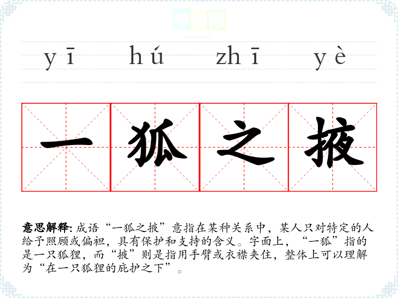 成语“一狐之掖”意指在某种关系中,某人只对特定的人给予照顾或偏袒,具有保护和支持的含义。字面上,“一狐”指的是一只狐狸,而“掖”则是指用手臂或衣襟夹住,整体上可以理解为“在一只狐狸的庇护之下”。