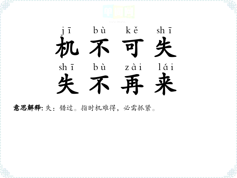 | 机不可失,失不再来 | 失:错过。指时机难得,必需抓紧。 |