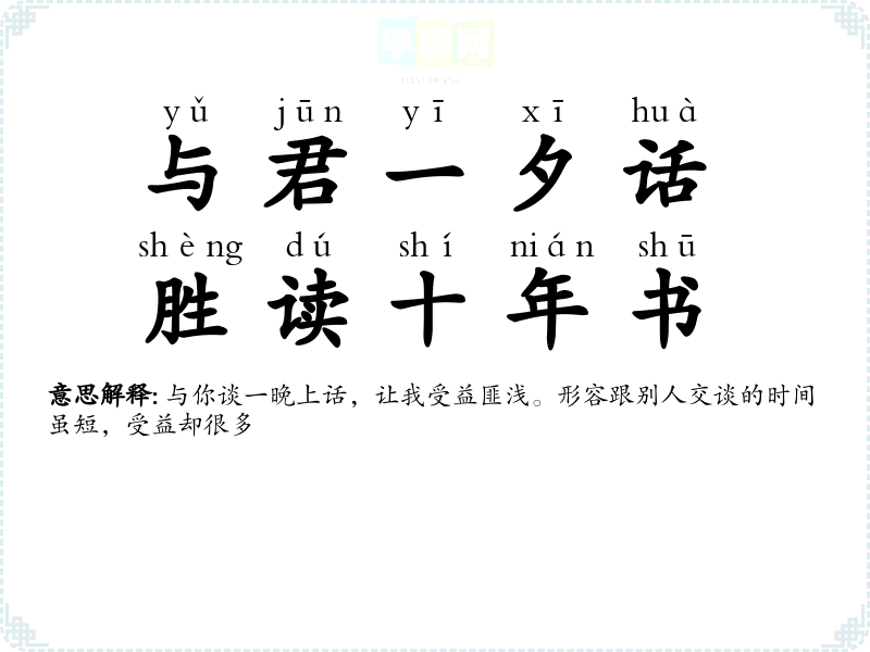 | 与君一夕话,胜读十年书 | 与你谈一晚上话,让我受益匪浅。形容跟别人交谈的时间虽短,受益却很多 |