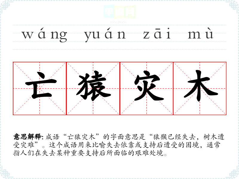 成语“亡猿灾木”的字面意思是“猿猴已经失去,树木遭受灾难”。这个成语用来比喻失去依靠或支持后遭受的困境,通常指人们在失去某种重要支持后所面临的艰难处境。