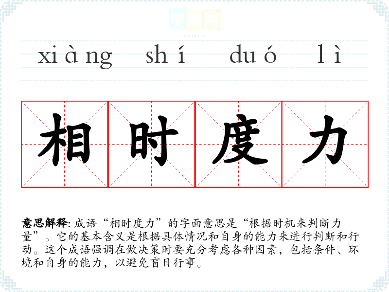 - “审时度势”:根据时间和形势来判断和决策,与“相时度力”相近。