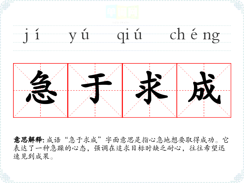 成语“急于求成”字面意思是指心急地想要取得成功。它表达了一种急躁的心态,强调在追求目标时缺乏耐心,往往希望迅速见到成果。