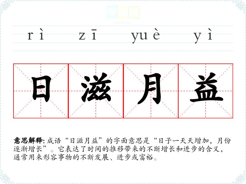 | 日益月滋 | 一天天一月月地增添、加多。 |