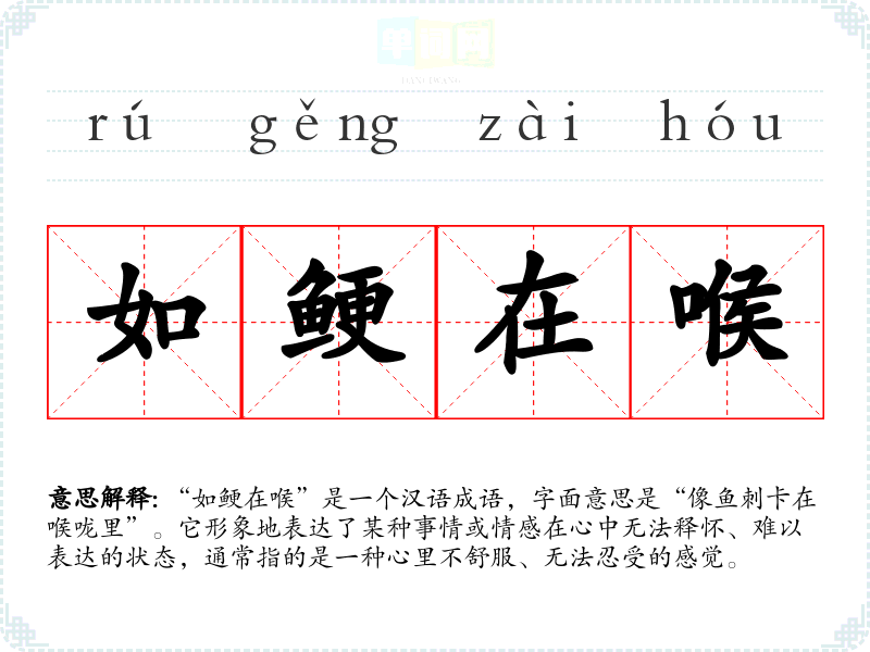 “如鲠在喉”是一个汉语成语,字面意思是“像鱼刺卡在喉咙里”。它形象地表达了某种事情或情感在心中无法释怀、难以表达的状态,通常指的是一种心里不舒服、无法忍受的感觉。