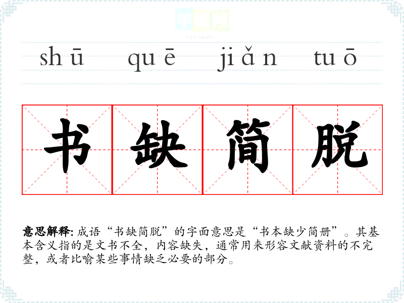 成语“书缺简脱”的字面意思是“书本缺少简册”。其基本含义指的是文书不全,内容缺失,通常用来形容文献资料的不完整,或者比喻某些事情缺乏必要的部分。
