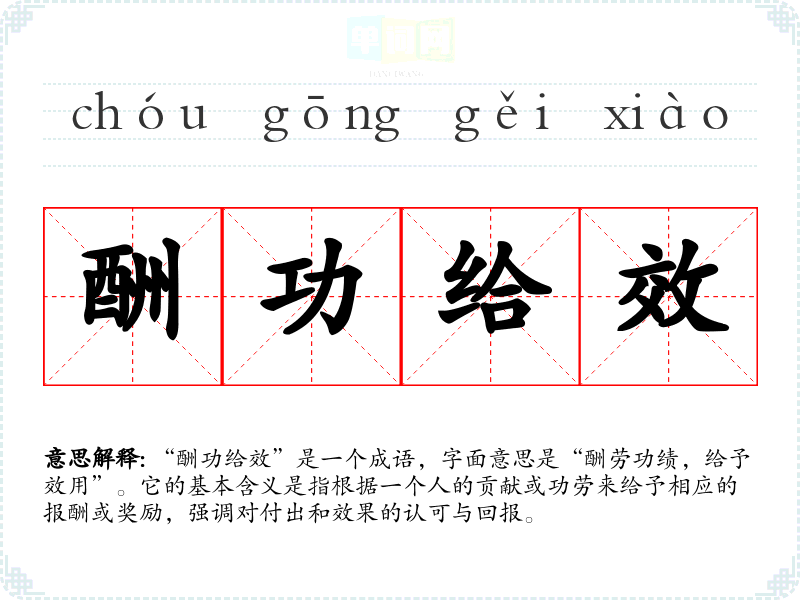 “酬功给效”是一个成语,字面意思是“酬劳功绩,给予效用”。它的基本含义是指根据一个人的贡献或功劳来给予相应的报酬或奖励,强调对付出和效果的认可与回报。