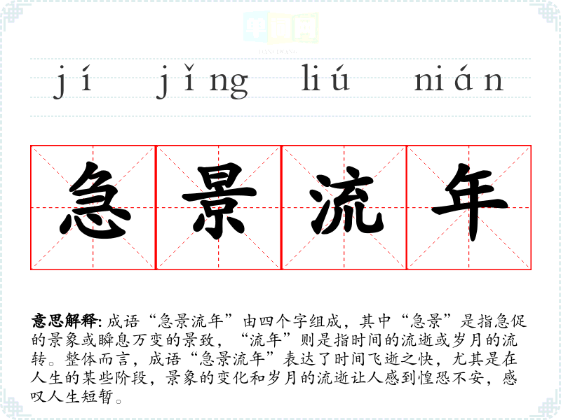 成语“急景流年”由四个字组成,其中“急景”是指急促的景象或瞬息万变的景致,“流年”则是指时间的流逝或岁月的流转。整体而言,成语“急景流年”表达了时间飞逝之快,尤其是在人生的某些阶段,景象的变化和岁月的流逝让人感到惶恐不安,感叹人生短暂。