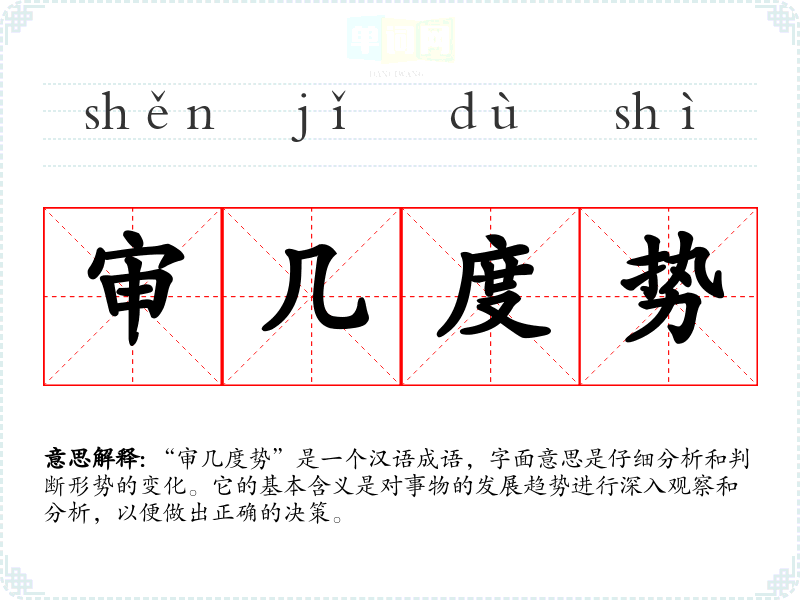 “审几度势”是一个汉语成语,字面意思是仔细分析和判断形势的变化。它的基本含义是对事物的发展趋势进行深入观察和分析,以便做出正确的决策。