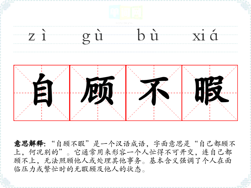 “自顾不暇”是一个汉语成语,字面意思是“自己都顾不上,何况别的”。它通常用来形容一个人忙得不可开交,连自己都顾不上,无法照顾他人或处理其他事务。基本含义强调了个人在面临压力或繁忙时的无暇顾及他人的状态。
