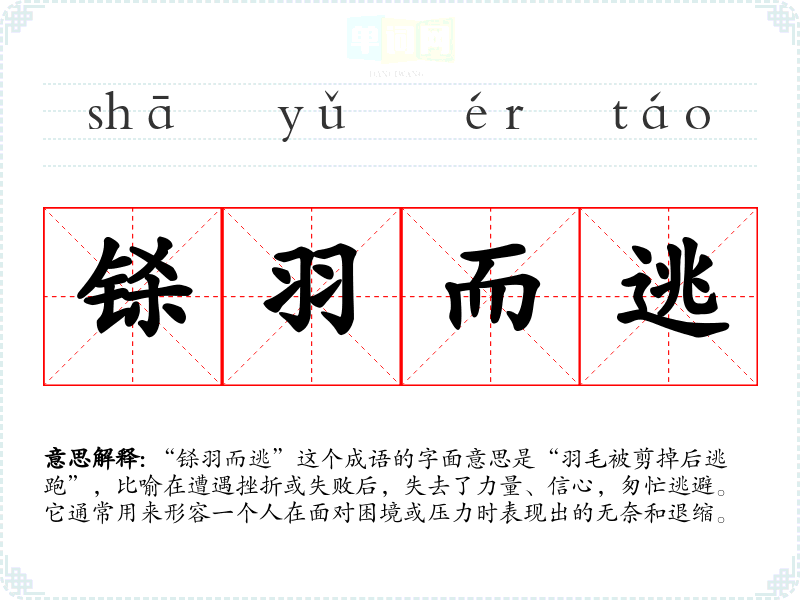 “铩羽而逃”这个成语的字面意思是“羽毛被剪掉后逃跑”,比喻在遭遇挫折或失败后,失去了力量、信心,匆忙逃避。它通常用来形容一个人在面对困境或压力时表现出的无奈和退缩。