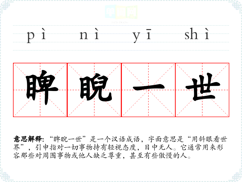 “睥睨一世”是一个汉语成语,字面意思是“用斜眼看世界”,引申指对一切事物持有轻视态度,目中无人。它通常用来形容那些对周围事物或他人缺乏尊重,甚至有些傲慢的人。