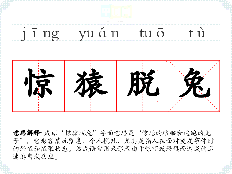 成语“惊猿脱兔”字面意思是“惊恐的猿猴和逃跑的兔子”。它形容情况紧急,令人慌乱,尤其是指人在面对突发**时的恐慌和慌张状态。该成语常用来形容由于惊吓或恐惧而造成的迅速逃离或反应。