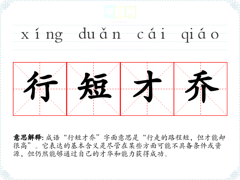 成语“行短才乔”字面意思是“行走的路程短,但才能却很高”。它表达的基本含义是尽管在某些方面可能不具备条件或资源,但仍然能够通过自己的才华和能力获得成功。