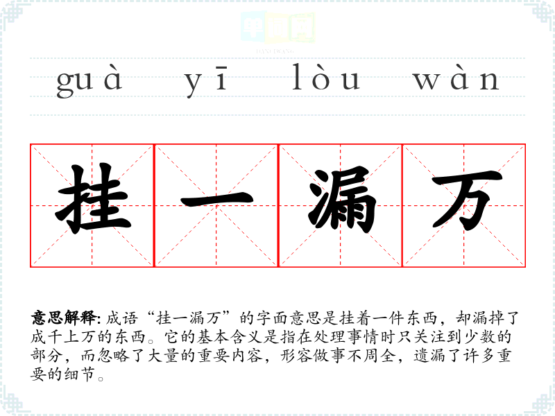 成语“挂一漏万”的字面意思是挂着一件东西,却漏掉了成千上万的东西。它的基本含义是指在处理事情时只关注到少数的部分,而忽略了大量的重要内容,形容做事不周全,遗漏了许多重要的细节。