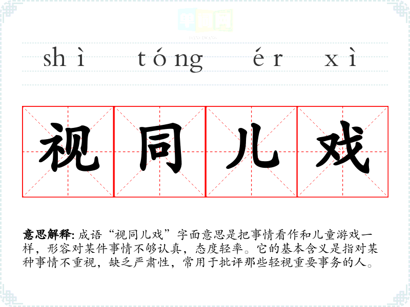 成语“视同儿戏”字面意思是把事情看作和儿童游戏一样,形容对某件事情不够认真,态度轻率。它的基本含义是指对某种事情不重视,缺乏严肃性,常用于批评那些轻视重要事务的人。