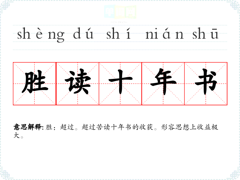 | 胜读十年书 | 胜:超过。超过苦读十年书的收获。形容思想上收益极大。 |