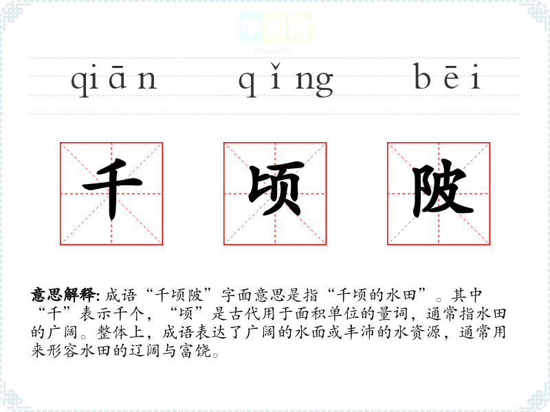 成语“千顷陂”字面意思是指“千顷的水田”。其中“千”表示千个,“顷”是古代用于面积单位的量词,通常指水田的广阔。整体上,成语表达了广阔的水面或丰沛的水资源,通常用来形容水田的辽阔与富饶。