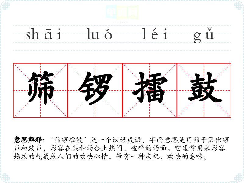 “筛锣擂鼓”是一个汉语成语,字面意思是用筛子筛出锣声和鼓声,形容在某种场合上热闹、喧哗的场面。它通常用来形容热烈的气氛或人们的欢快心情,带有一种庆祝、欢快的意味。