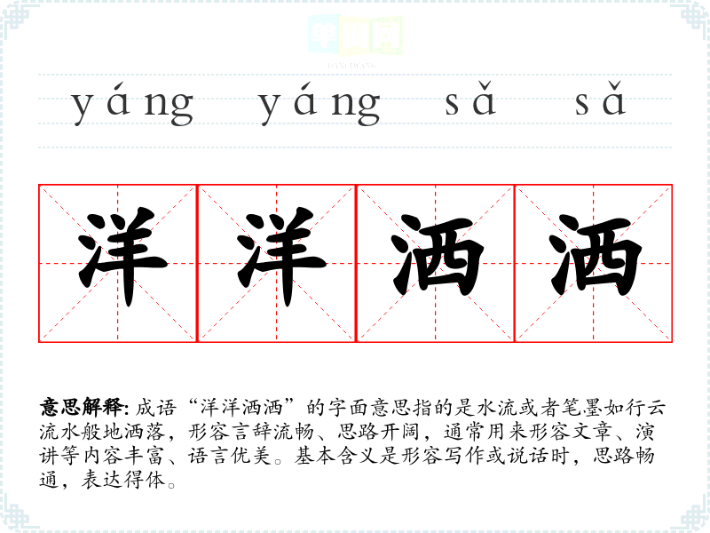 成语“洋洋洒洒”的字面意思指的是水流或者笔墨如行云流水般地洒落,形容言辞流畅、思路开阔,通常用来形容文章、演讲等内容丰富、语言优美。基本含义是形容写作或说话时,思路畅通,表达得体。
