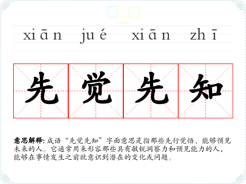 | 先觉先知 | 觉:觉悟;知:认识。指认识事理较一般人为早的人。 |