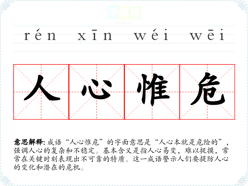 成语“人心惟危”的字面意思是“人心本就是危险的”,强调人心的复杂和不稳定。基本含义是指人心易变,难以捉摸,常常在关键时刻表现出不可靠的特质。这一成语警示人们要提防人心的变化和潜在的危机。