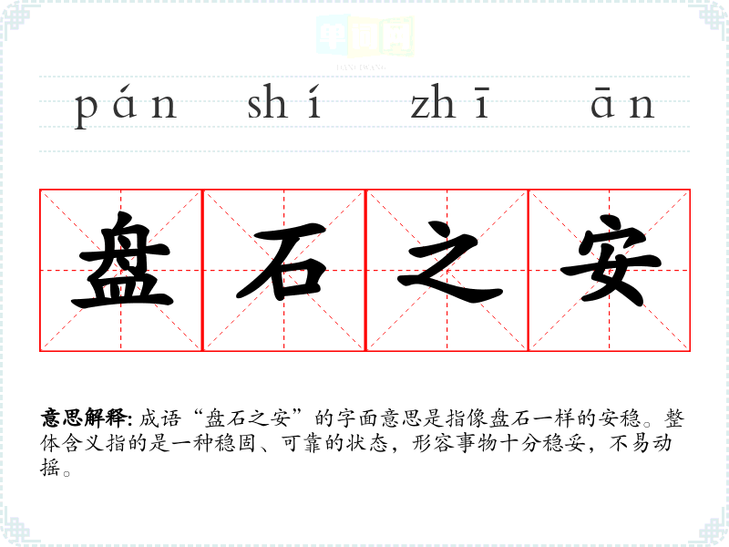 成语“盘石之安”的字面意思是指像盘石一样的安稳。整体含义指的是一种稳固、可靠的状态,形容事物十分稳妥,不易动摇。