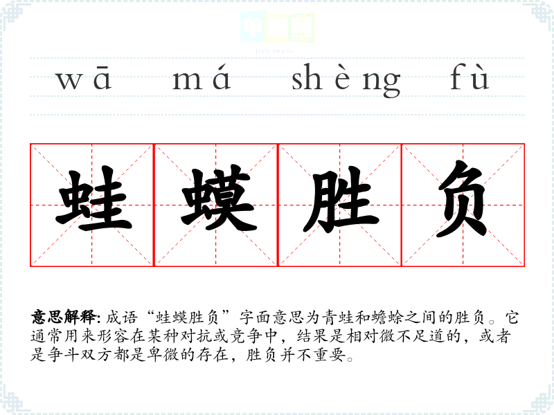 成语“蛙蟆胜负”字面意思为青蛙和蟾蜍之间的胜负。它通常用来形容在某种对抗或竞争中,结果是相对微不足道的,或者是争斗双方都是卑微的存在,胜负并不重要。