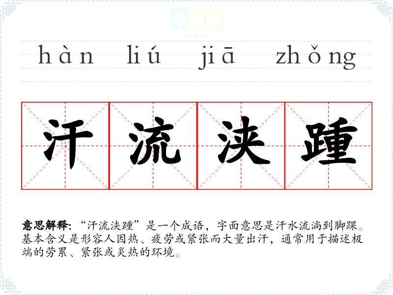 “汗流浃踵”是一个成语,字面意思是汗水流淌到脚踝。基本含义是形容人因热、疲劳或紧张而大量出汗,通常用于描述极端的劳累、紧张或炎热的环境。