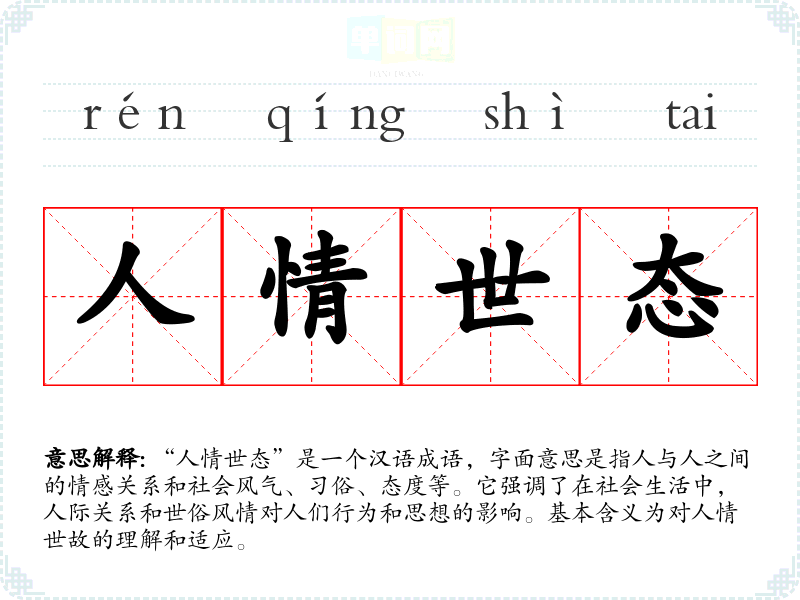 | 世态人情 | 指社会风尚和为人处世之道。 |
