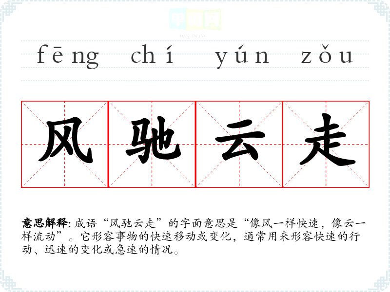 成语“风驰云走”的字面意思是“像风一样快速,像云一样流动”。它形容事物的快速移动或变化,通常用来形容快速的行动、迅速的变化或急速的情况。