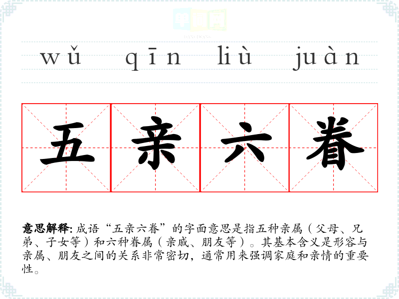 成语“五亲六眷”的字面意思是指五种亲属(父母、兄弟、子女等)和六种眷属(亲戚、朋友等)。其基本含义是形容与亲属、朋友之间的关系非常密切,通常用来强调家庭和亲情的重要性。