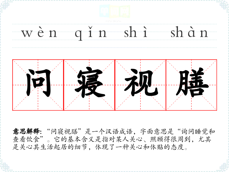 “问寝视膳”是一个汉语成语,字面意思是“询问睡觉和查看饮食”。它的基本含义是指对某人关心、照顾得很周到,尤其是关心其生活起居的细节,体现了一种关心和体贴的态度。