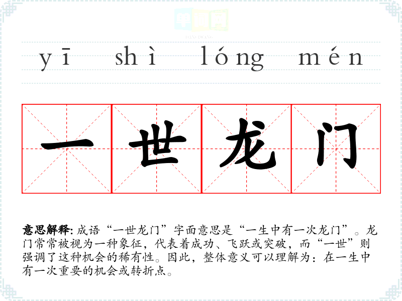 “一世龙门”并不是一个传统成语,而是受到了成语“鲤鱼跃龙门”的启发。这个成语源于**古代传说,鲤鱼跃过龙门后就能化为龙,象征着通过努力而获得成功的机会。与此相对,“一世龙门”强调的是这一机会的唯一性和珍贵性。