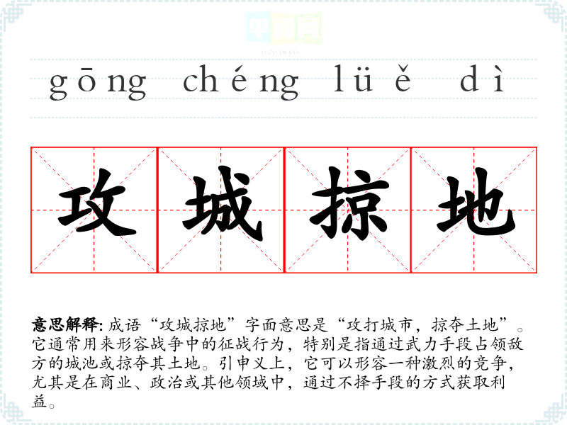成语“攻城掠地”字面意思是“攻打城市,掠夺土地”。它通常用来形容战争中的征战行为,特别是指通过武力手段占领敌方的城池或掠夺其土地。引申义上,它可以形容一种激烈的竞争,尤其是在商业、政治或其他领域中,通过不择手段的方式获取利益。