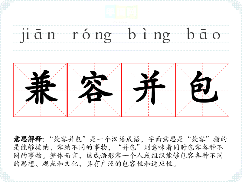 “兼容并包”是一个汉语成语,字面意思是“兼容”指的是能够接纳、容纳不同的事物,“并包”则意味着同时包容各种不同的事物。整体而言,该成语形容一个人或组织能够包容各种不同的思想、观点和文化,具有广泛的包容性和适应性。
