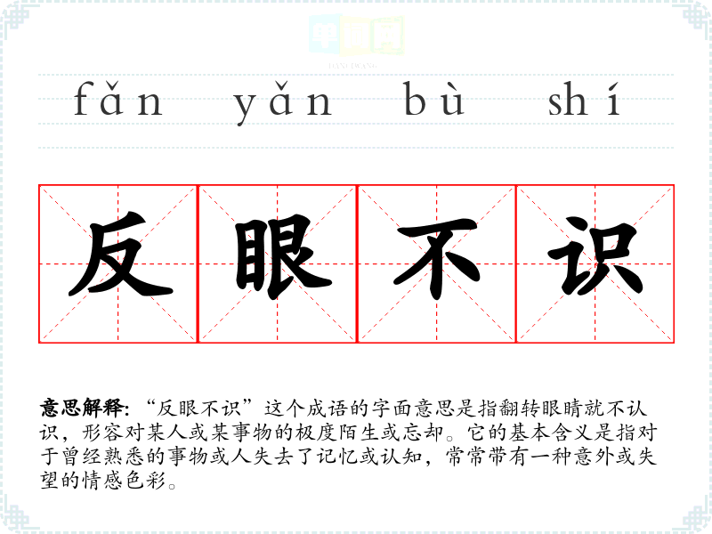 “反眼不识”的具体起源并不明确,但可以推测其发展与古代人们的交往和记忆有关。在古代社会,人与人之间的关系往往建立在相互认知的基础上,若一方对另一方产生了陌生感,往往会引发误解和冲突。因此,这个成语可以看作是对人际关系中认知失配的一种描述。