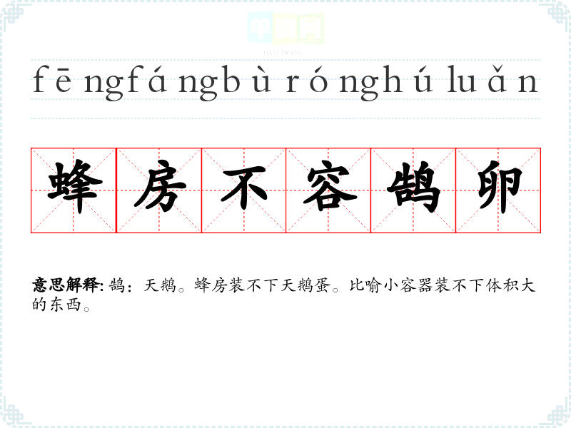 | 蜂房不容鹄卵 | 鹄:天鹅。蜂房装不下天鹅蛋。比喻小容器装不下体积大的东西。 |
