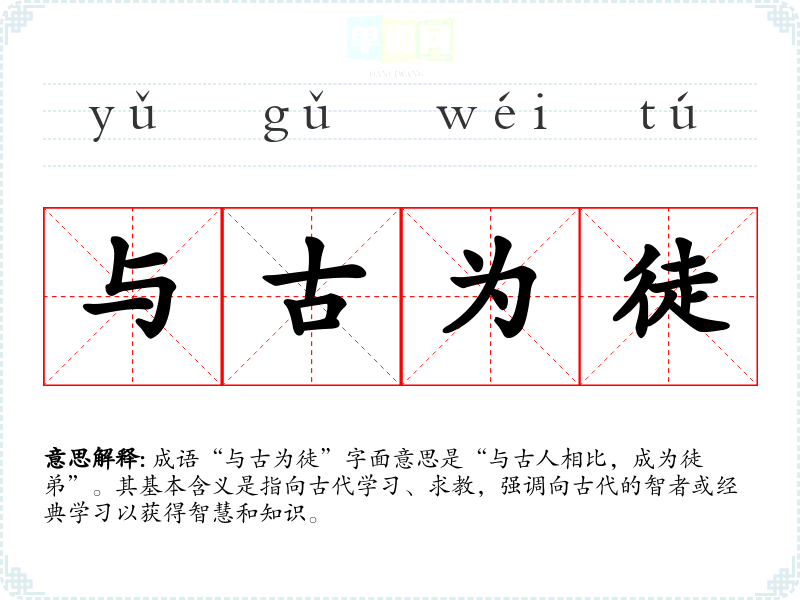 成语“与古为徒”字面意思是“与古人相比,成为徒弟”。其基本含义是指向古代学、求教,强调向古代的智者或经典学以获得智慧和知识。
