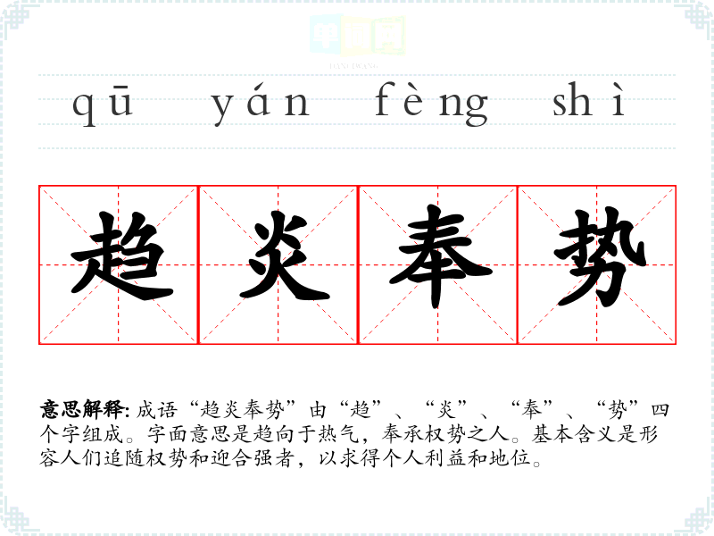 成语“趋炎奉势”由“趋”、“炎”、“奉”、“势”四个字组成。字面意思是趋向于热气,奉承权势之人。基本含义是形容人们追随权势和迎合强者,以求得个人利益和地位。