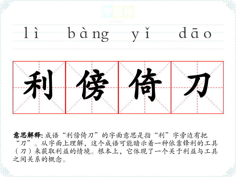 成语“利傍倚刀”的字面意思是指“利”字旁边有把“刀”。从字面上理解,这个成语可能暗示着一种依靠锋利的工具(刀)来获取利益的情境。根本上,它体现了一个关于利益与工具之间关系的概念。