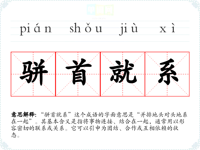 “骈首就系”这个成语的字面意思是“并排地头对头地系在一起”。其基本含义是指将事物连接、结合在一起,通常用以形容密切的联系或关系。它可以引申为团结、合作或互相依赖的状态。