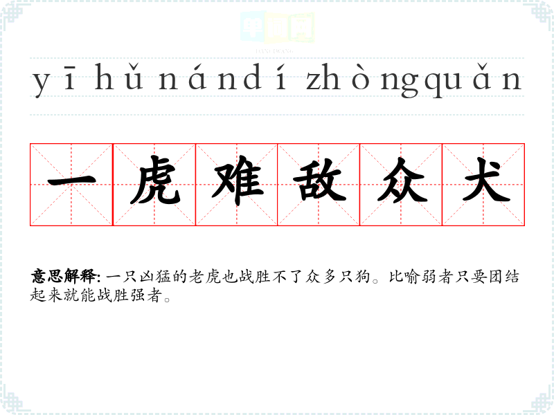 | 一虎难敌众犬 | 一只凶猛的老虎也战胜不了众多只狗。比喻弱者只要团结起来就能战胜强者。 |
