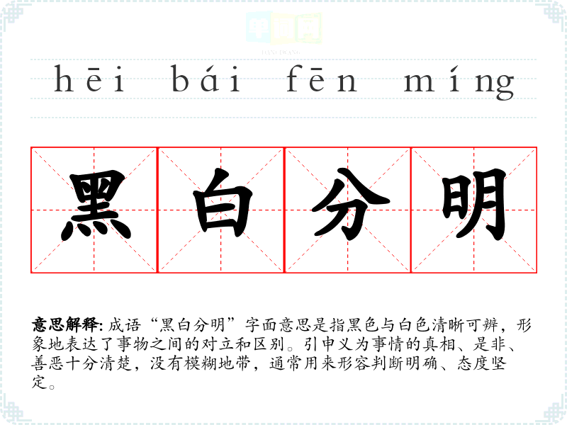 成语“黑白分明”字面意思是指黑色与白色清晰可辨,形象地表达了事物之间的对立和区别。引申义为事情的真相、是非、善恶十分清楚,没有模糊地带,通常用来形容判断明确、态度坚定。