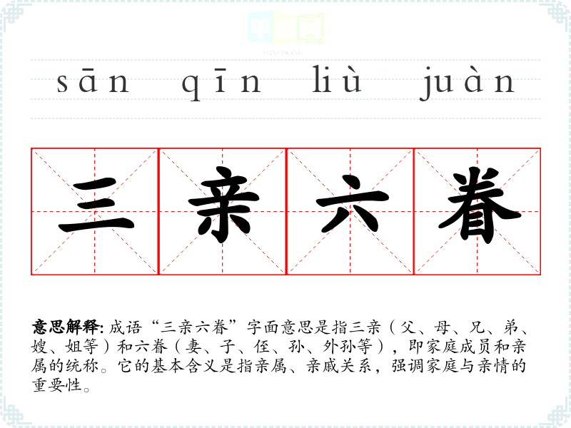 成语“三亲六眷”字面意思是指三亲(父、母、兄、弟、嫂、姐等)和六眷(妻、子、侄、孙、外孙等),即家庭成员和亲属的统称。它的基本含义是指亲属、亲戚关系,强调家庭与亲情的重要性。