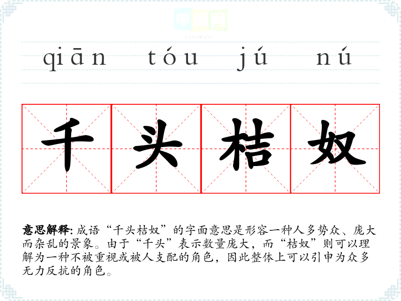 成语“千头桔奴”的字面意思是形容一种人多势众、庞大而杂乱的景象。由于“千头”表示数量庞大,而“桔奴”则可以理解为一种不被重视或被人支配的角色,因此整体上可以引申为众多无力反抗的角色。