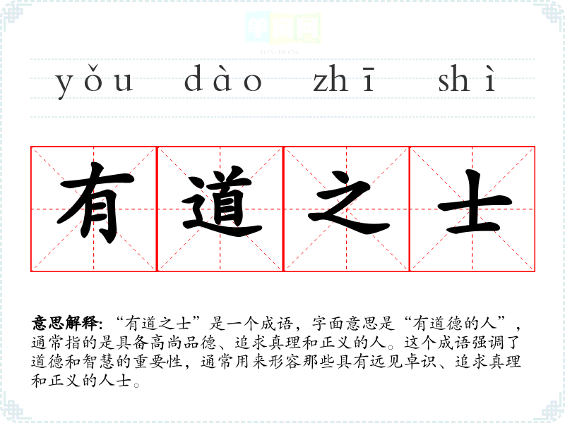 “有道之士”是一个成语,字面意思是“有道德的人”,通常指的是具备高尚品德、追求真理和正义的人。这个成语强调了道德和智慧的重要性,通常用来形容那些具有远见卓识、追求真理和正义的人士。