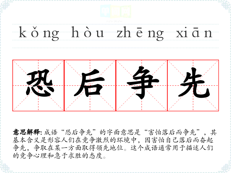 | 恐后争先 | 指害怕落后,追求上进。 |