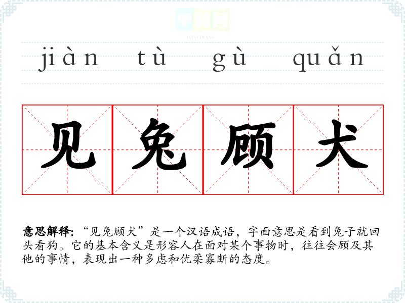 “见兔顾犬”是一个汉语成语,字面意思是看到兔子就回头看狗。它的基本含义是形容人在面对某个事物时,往往会顾及其他的事情,表现出一种多虑和优柔寡断的态度。