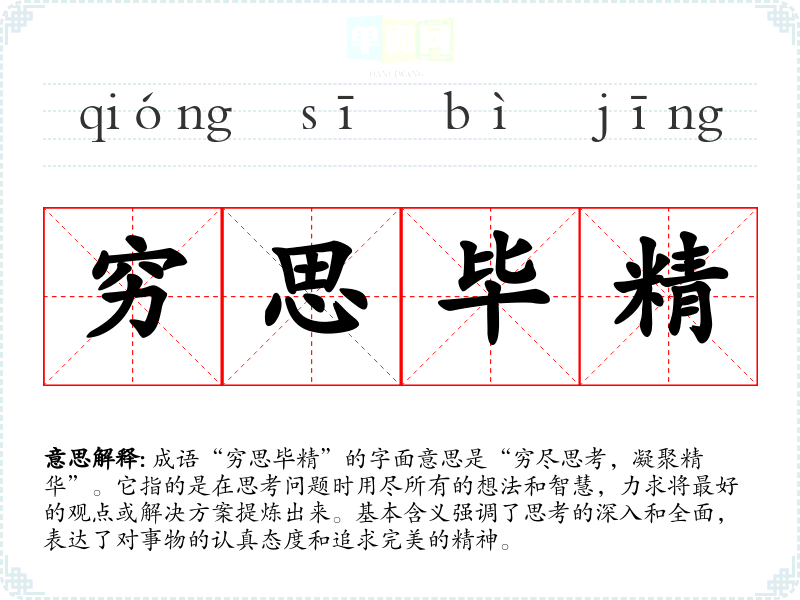 成语“穷思毕精”的字面意思是“穷尽思考,凝聚精华”。它指的是在思考问题时用尽所有的想法和智慧,力求将最好的观点或解决方案提炼出来。基本含义强调了思考的深入和全面,表达了对事物的认真态度和追求完美的精神。