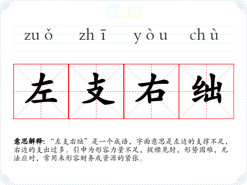 “左支右绌”是一个成语,字面意思是左边的支撑不足,右边的支出过多。引申为形容力量不足,捉襟见肘,形势困难,无法应对,常用来形容财务或资源的紧张。